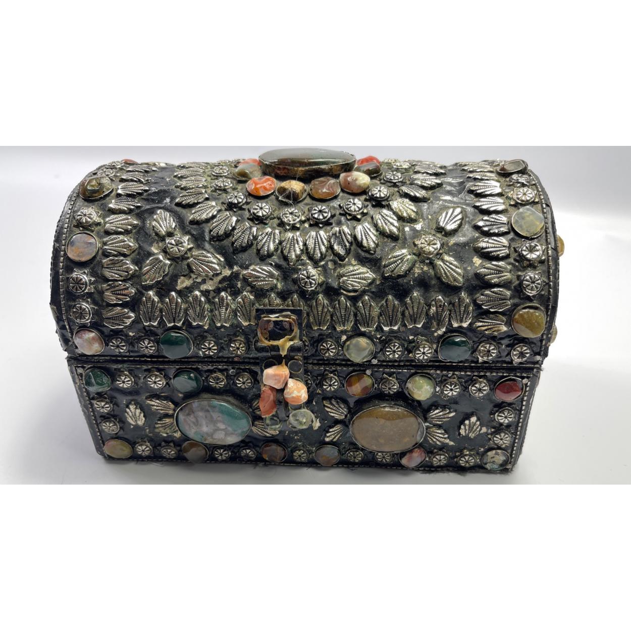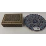 A small PERSIAN inlaid box with bone trim, the box measures 13cm x 9cm x 4cm and is inlaid inside and out, also a modern 16cm TURKISH ceramic trivet