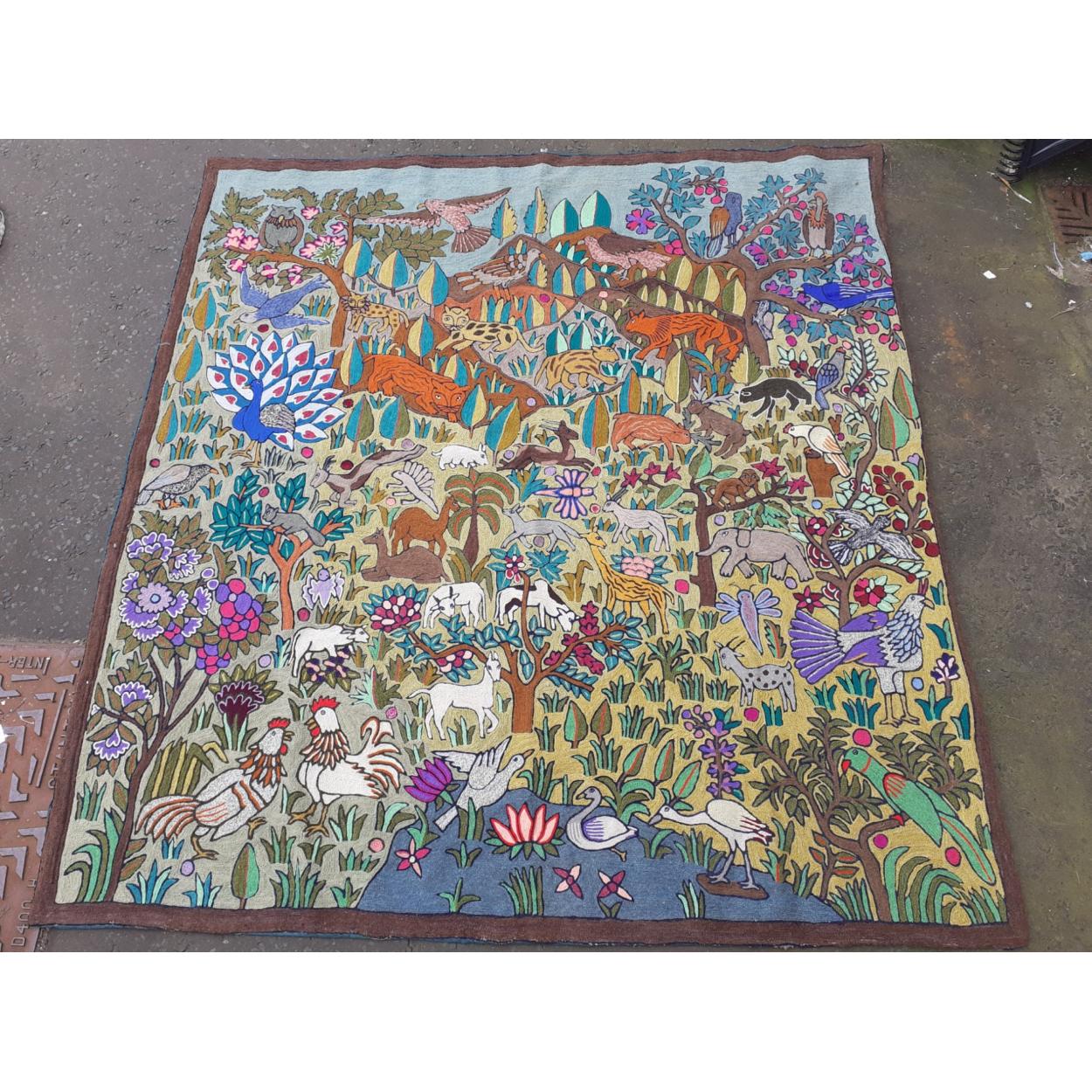 A super vibrant vintage large embroidered wool work wall hanging fully backed filled with fantastic naturalistic scenes. Measures 175x185cm approx