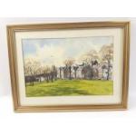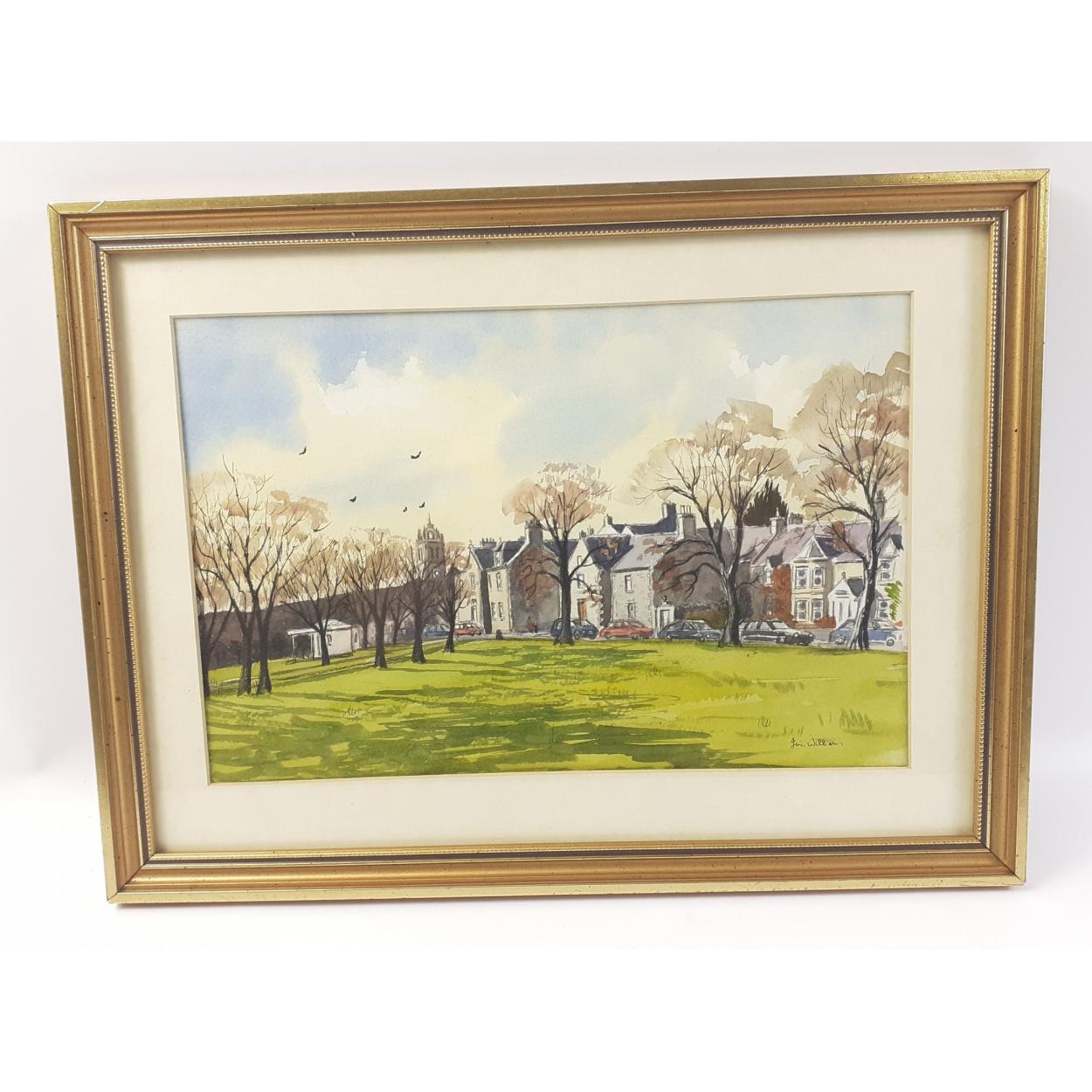 An original water colour in gilt frame of PEEBLES TWEED GREEN by Jim Williams and dated 1999 on the rear. A pleasant picture well executed. Frame size 40 x 30cm.