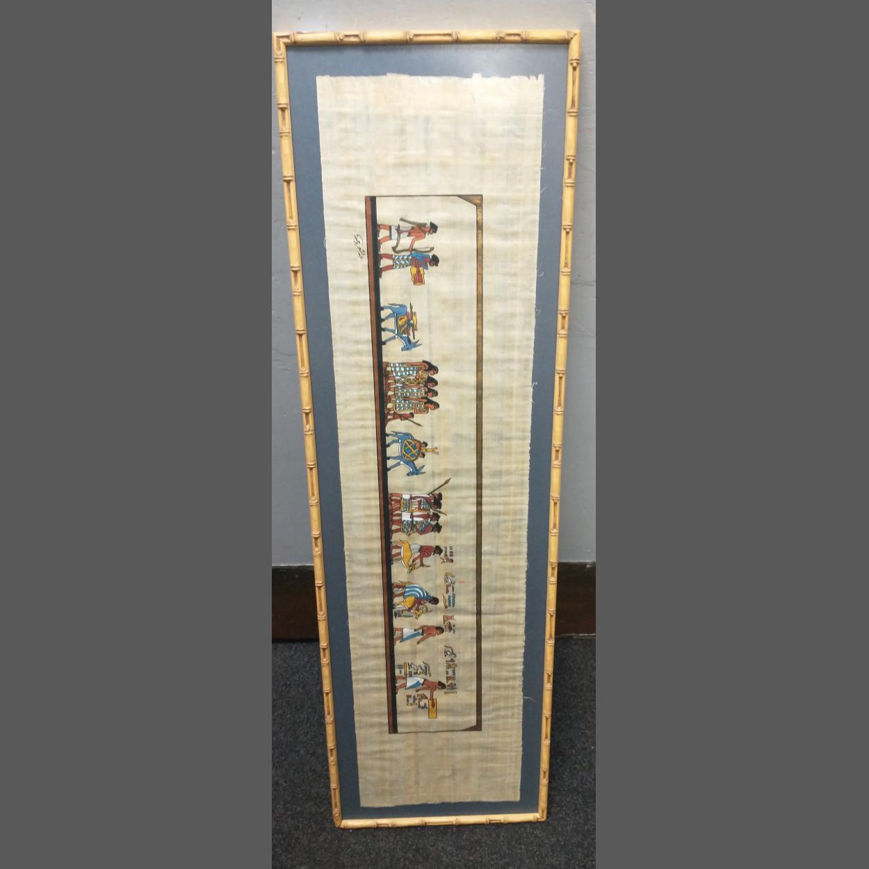 An Egyptian papyrus picture frame measures 98x29cm