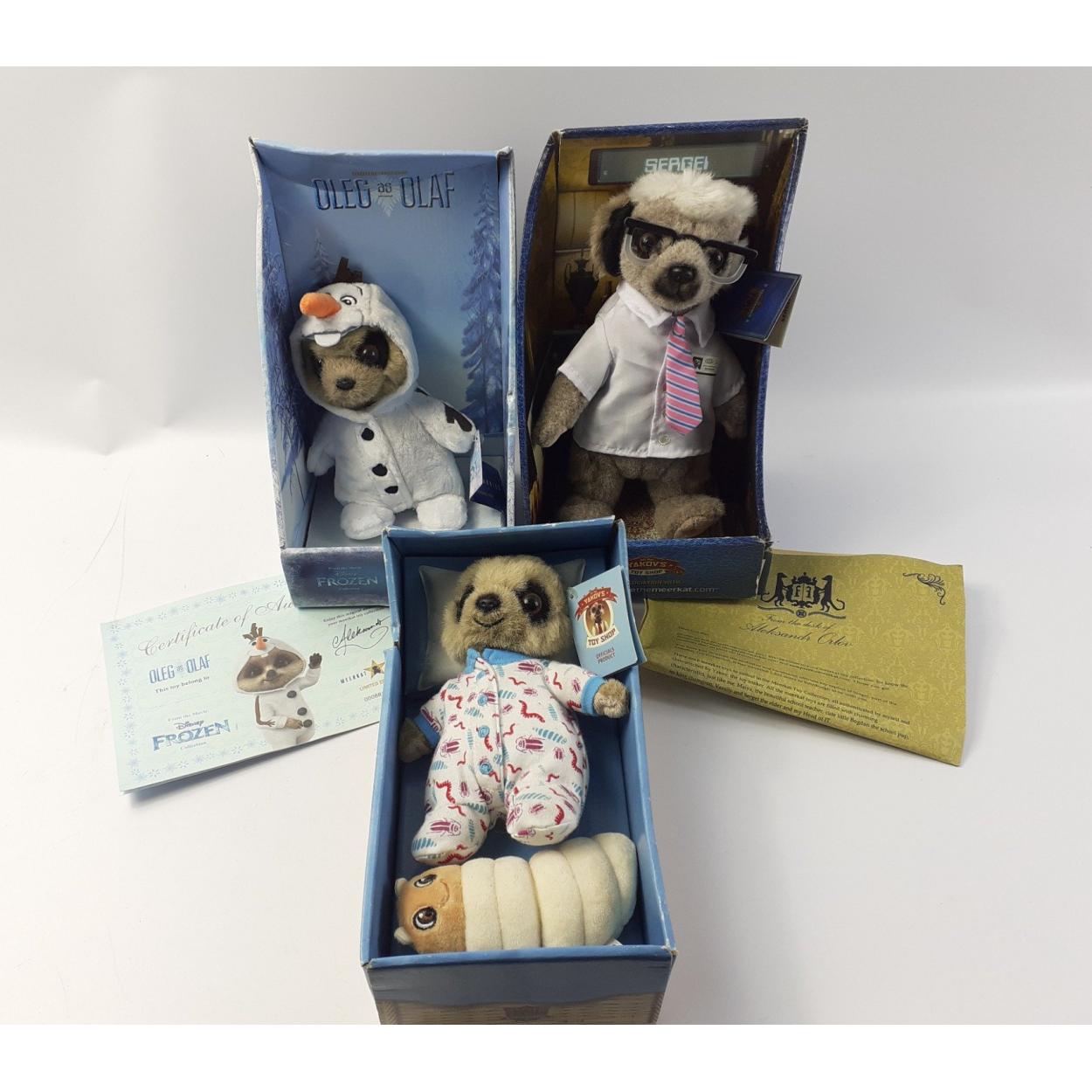 A collection of three MEERKAT soft toys in boxes. To include OLEG as OLAF from frozen, SERGEI and BABY OLEG