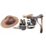 Vintage Scout Hat with a size label stating Long Oval 7 3/4. Also includes a Sam Brown style cross belt a small khaki belt, a Girl Guide belt and a pair of binoculars marked 'Jumelle Marine' with good optics but body A/F also another pair of binoculars in small fitted case and a T.G. Co. Lts Military MkI Broad Arrow marked marching compass.
