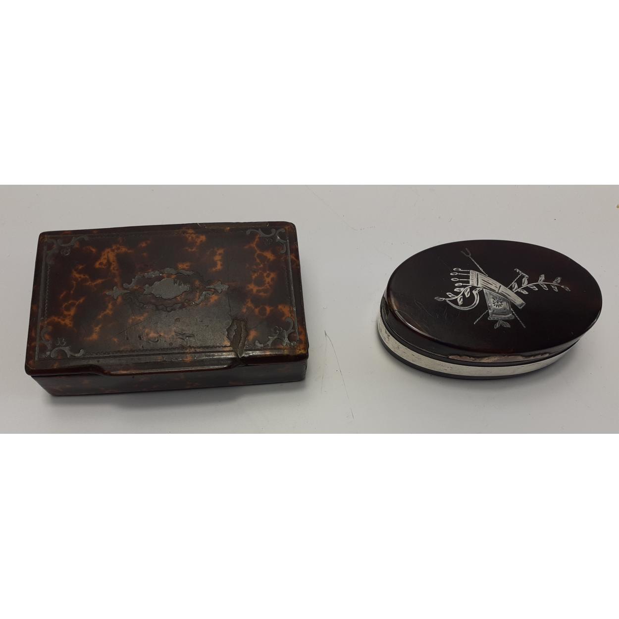 Two antique tortoise shell snuff boxes, an oval one with white metal inlay to the lid and similar band around the body of the box perhaps applied as a repair to a split the box has a brass hinge and a yellow metal panel to the front, measures 7.5cm long the second box is papier mache with tortoise shell veneer, some wear to the veneer however the box is still solid, measures 9.5cm x 6cm x 2.5cm