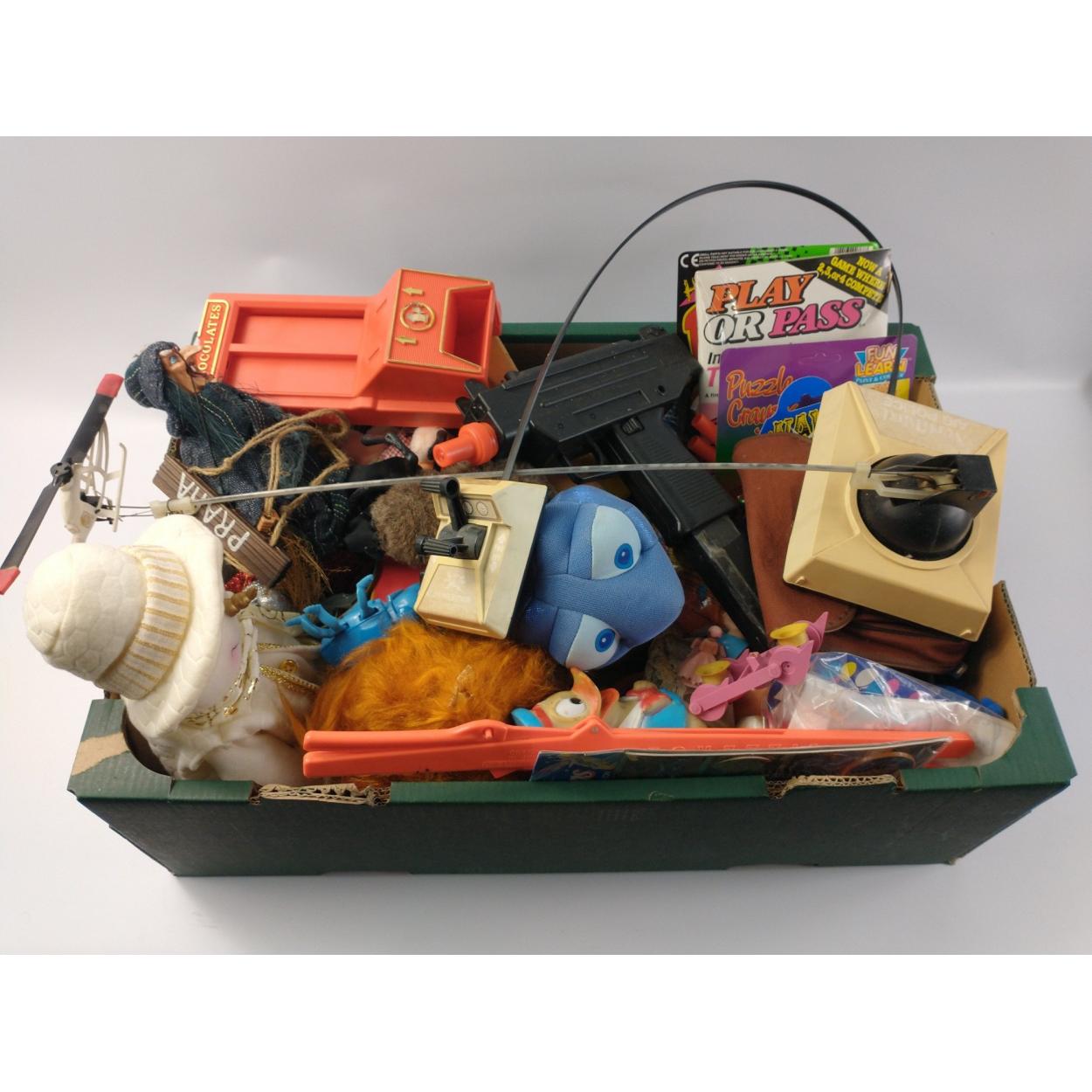 A selection of childrens toys and party gifts. Includes small globe, battery Christmas Snowman, boing puppet, clown toy, pop up book, soft toys, boomerangs and much else. An interesting fun lot for the younger bidder !