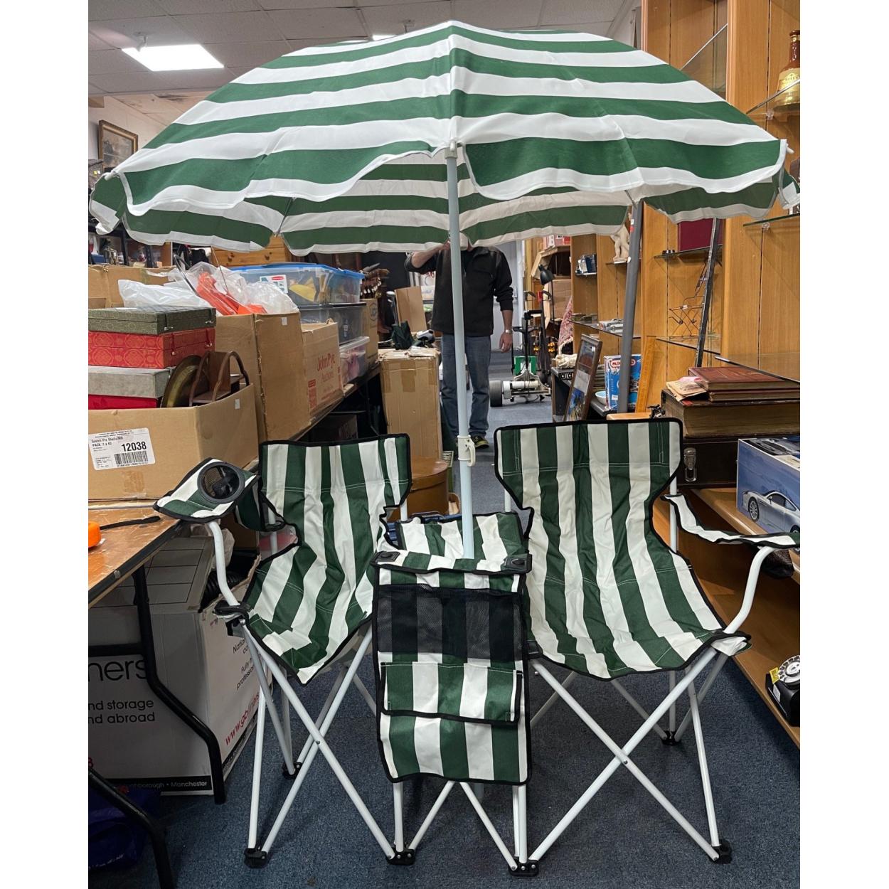 A folding two seater garden armchairs with middle table and an extending parasol ensemble! - in stunning green and white strped effect nylon fabric! - all folds into a nice carry-bag to carry down to the beach or for fishing!