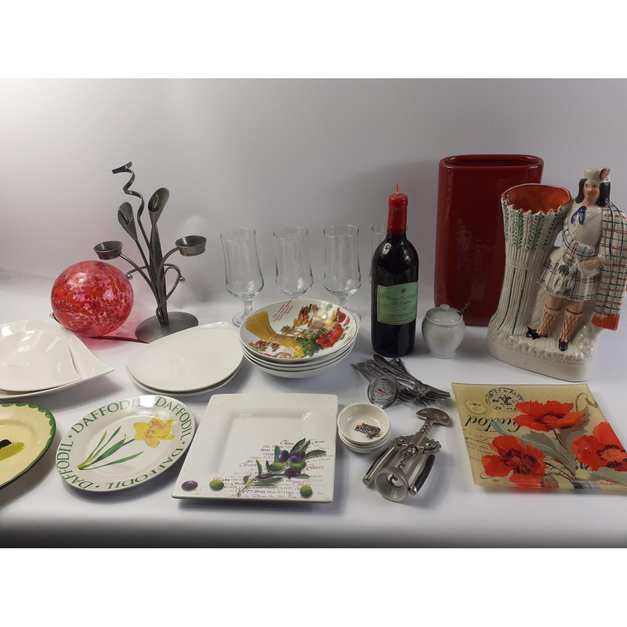 A box of assorted ceramics and glass to include a FLATBACK , LARGE RED VASE , METAL CANDLE HOLDER and several PLATES etc