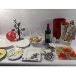 A mixed box to include a NIKON coolpix 885 camera, an onyx pepper grinder and saltcellar (approx 11cm high), various glass items, 3 ROYAL STAFFORDSHIRE serving plates 19x16cm, 23x19cm and 27x21cm, a small white metal sugar scuttle with scoop (approx 11cm high), a mini chestnut roaster in wood and brass (22cm long)
