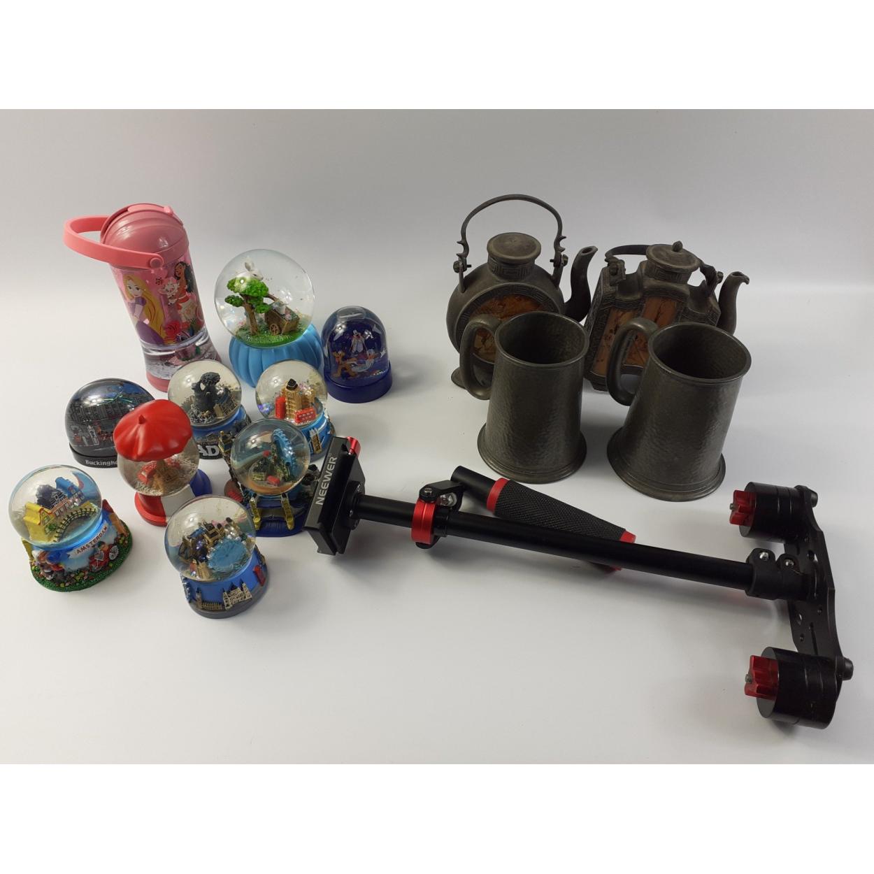 MIXED BOX containing a selection of SNOW GLOBES , two TANKARDS , two Oriental TEAPOTS A/F and a NEEWER camera gimbal
