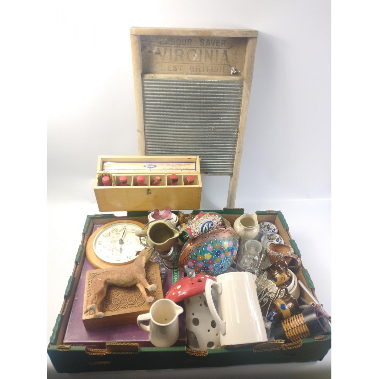 A QUALITY mixed box to include treasures such as a cow bell with embroidered strap, an old wash-board, a carved wooden box, and lots of various pieces of china
