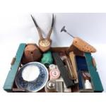 A mixed box to include fan heather, Trivial Pursuit, boxed corkscrew, carriage clock and other miniature, a hammer and a 1937 Coronation pressed glass plate.