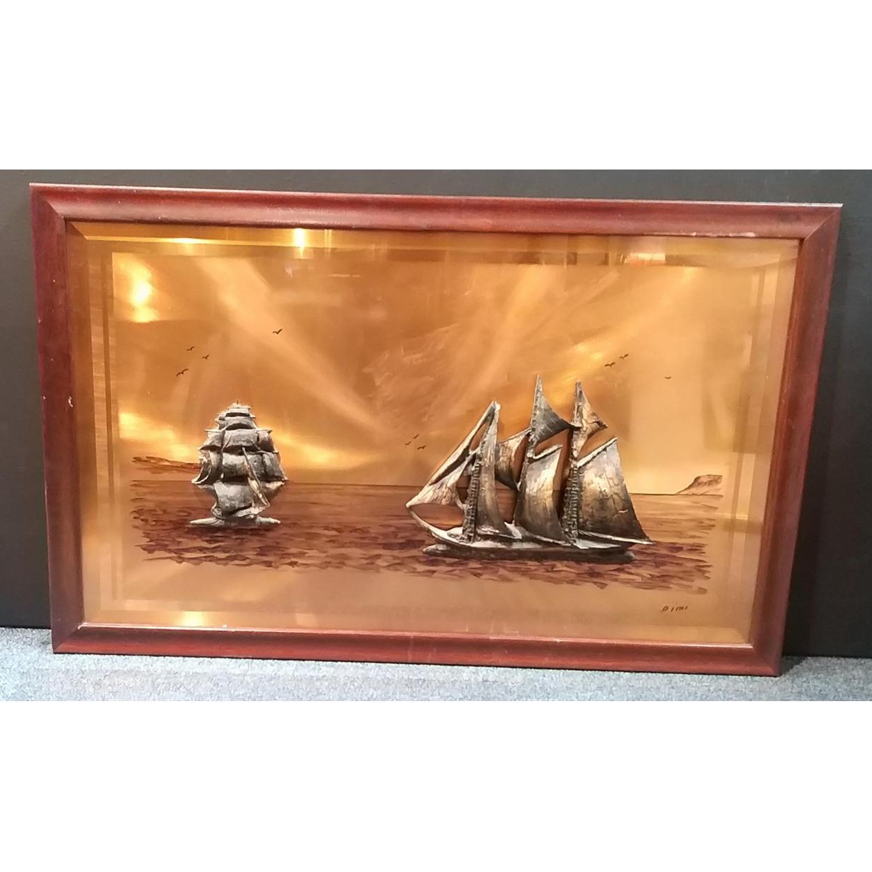A large retro pure copper DIMI'S Art Ltd. embossed framed wall hanging piece with maritime interest. 80cm x 50cm approx.