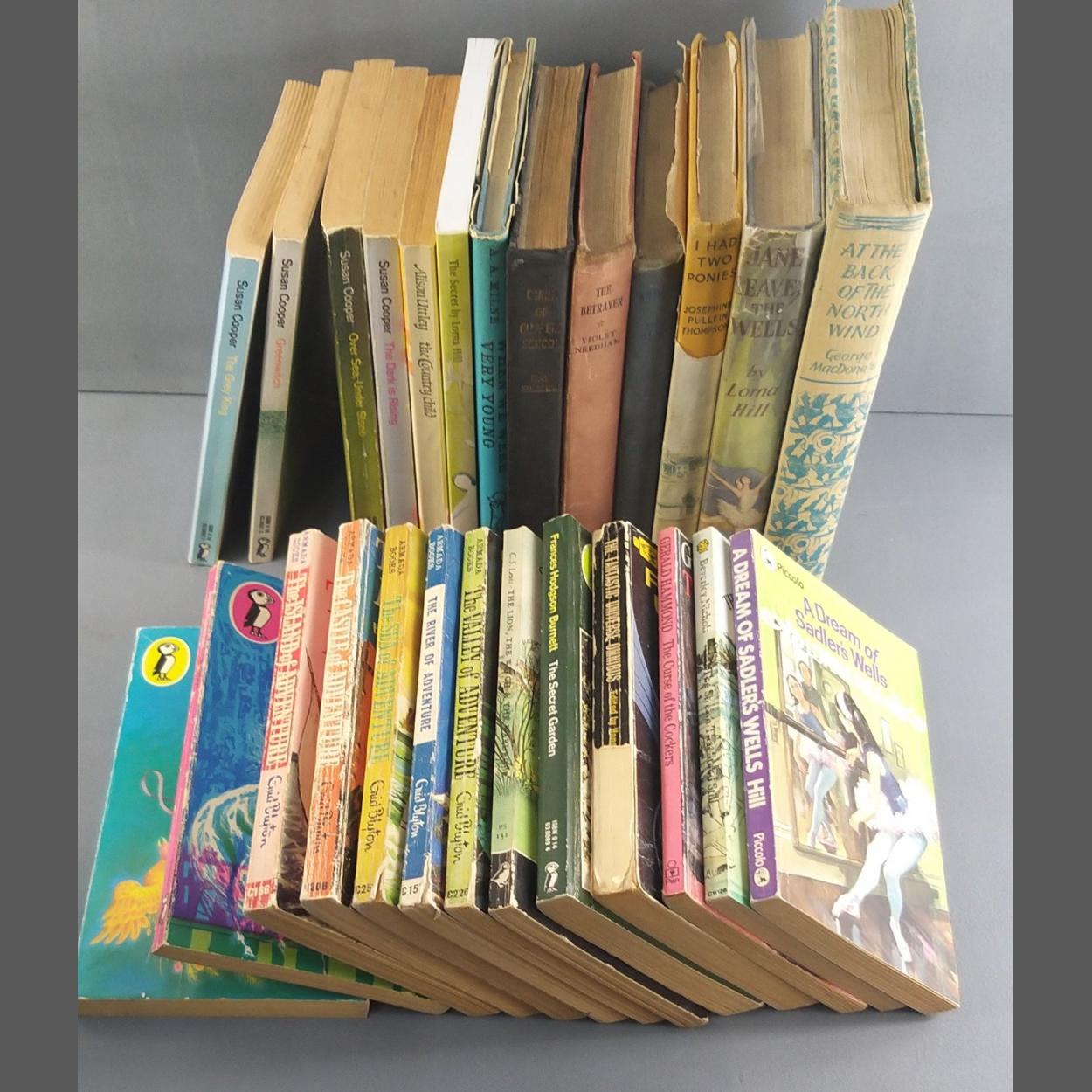 A box of interesting hard back and paperback books. Some Susan Cooper Puffins, Enid Blyton etc.