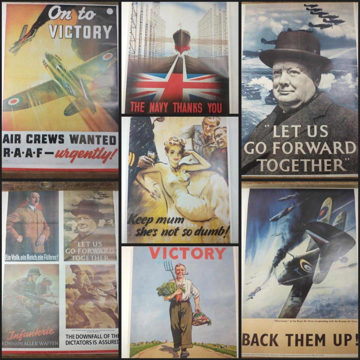 WWII POSTERS. Modern rolled reproductions of some very famous WWII era posters to include BACK THEM UP (RAF fighters in action), KEEP MUM, THE NAVY THANKS YOU, DIG FOR VICTORY and of course WINSTON CHURCHILL himself and two others. Seven posters in total.