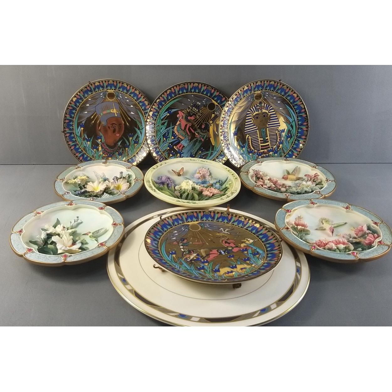 A selection of decorative plates to include four ROYAL WORCESTER Legends of the Nile and four Morning Jewels from LENA LIU plus a large cake plate by ROYAL WORCESTER, and others