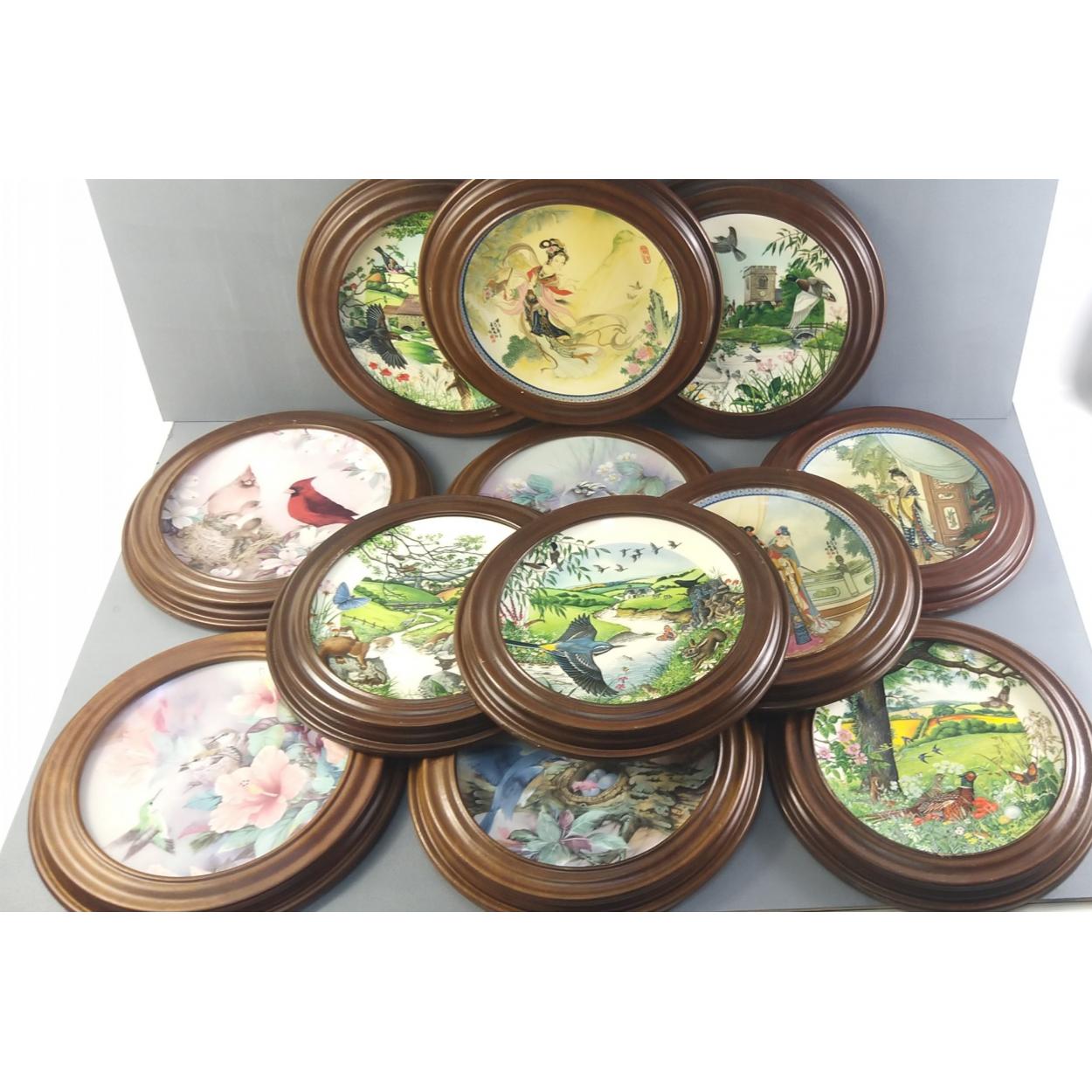 Twelve decorative plates including Oriental scenes and birds all presented in Van Hygan & Smythe plate frames
