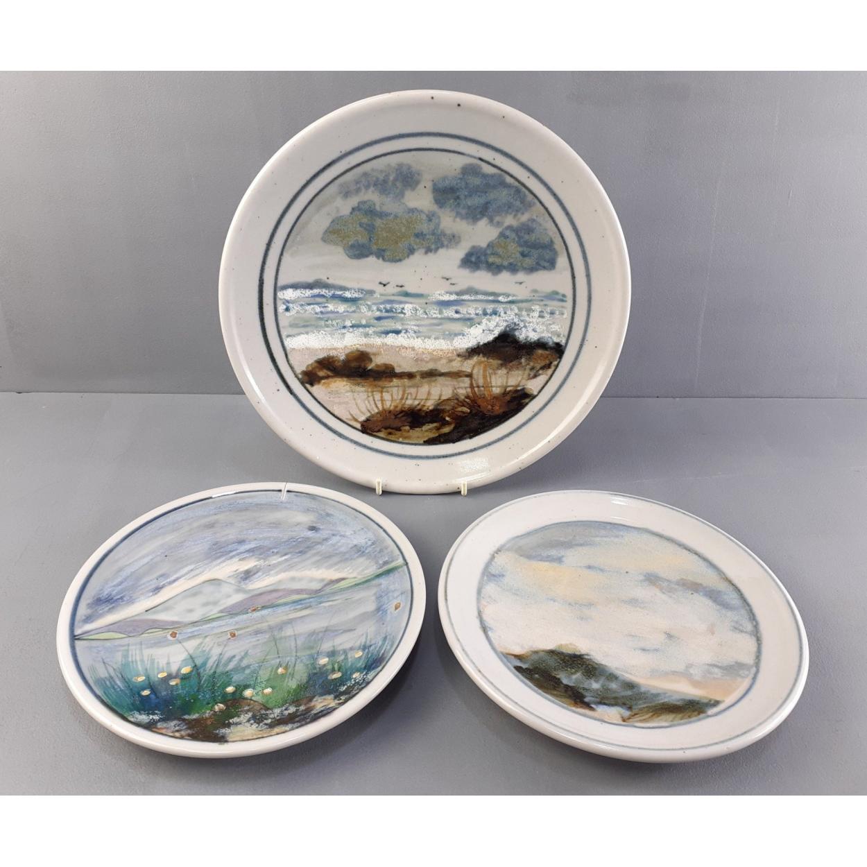 HIGHLAND STONEWARE. Three plates. Lovely earthy pattern plates, 26cm plate and one other. Also a factory second plate with edge split.