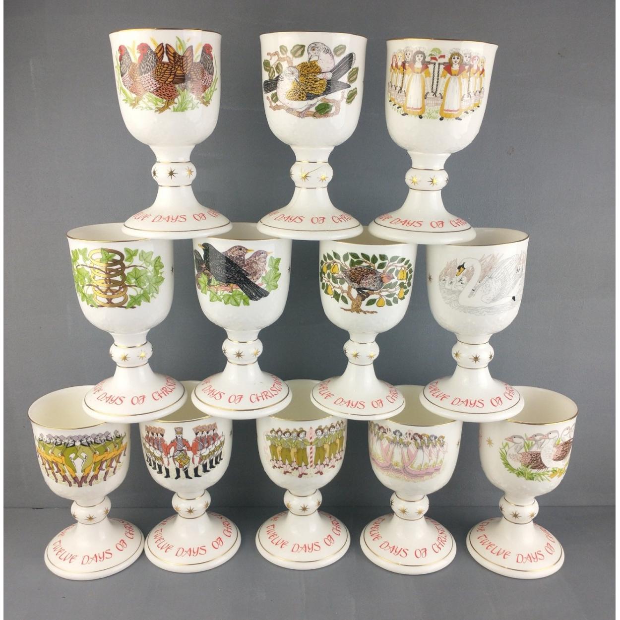 A set of twelve ROYAL DOULTON 12 days of Christmas goblets. One has a significant crack to the base (2nd day). Others all in excellent order.