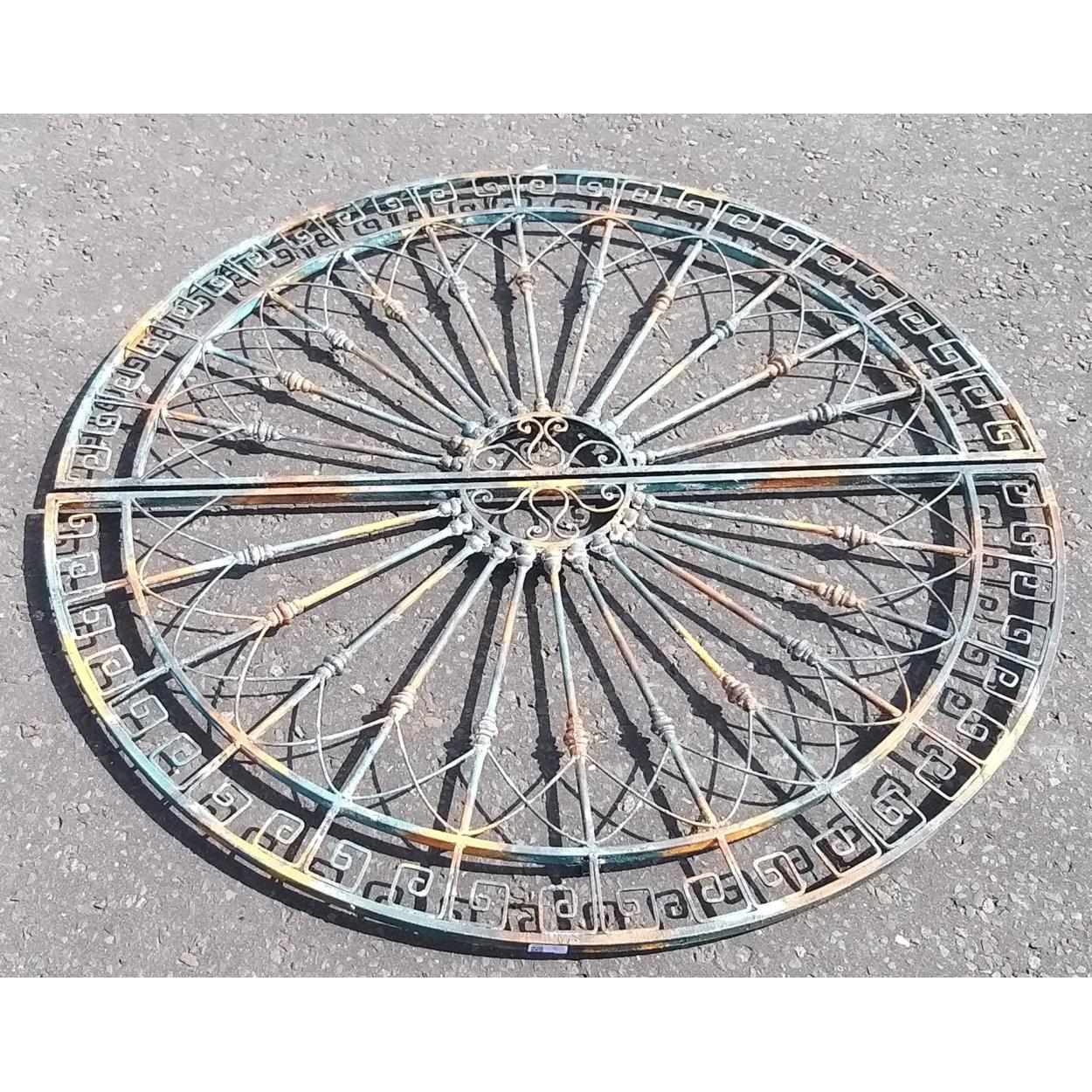 A pair of decorative metal transom fanlights.120cm across approx. Age uncertain, modern paint. Nice pair of interesting decorative items.