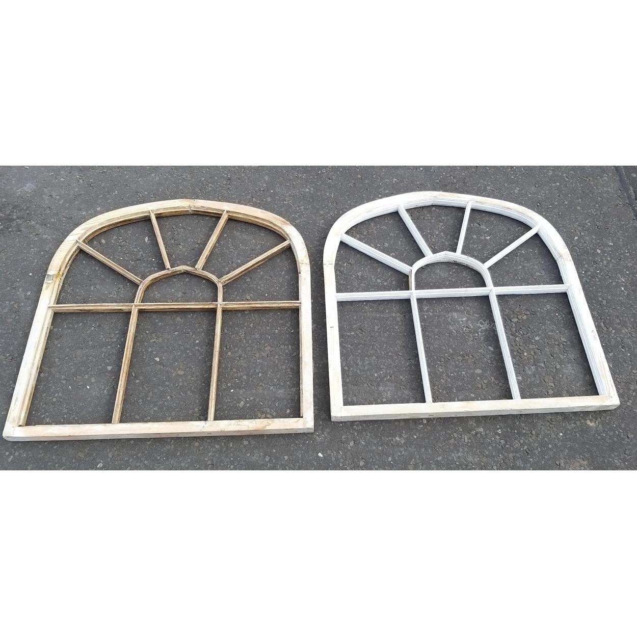 A pair of reclaimed wooden arch frames with 9 spaces for panes. Each measures 94cm tall and 90cm wide approx.