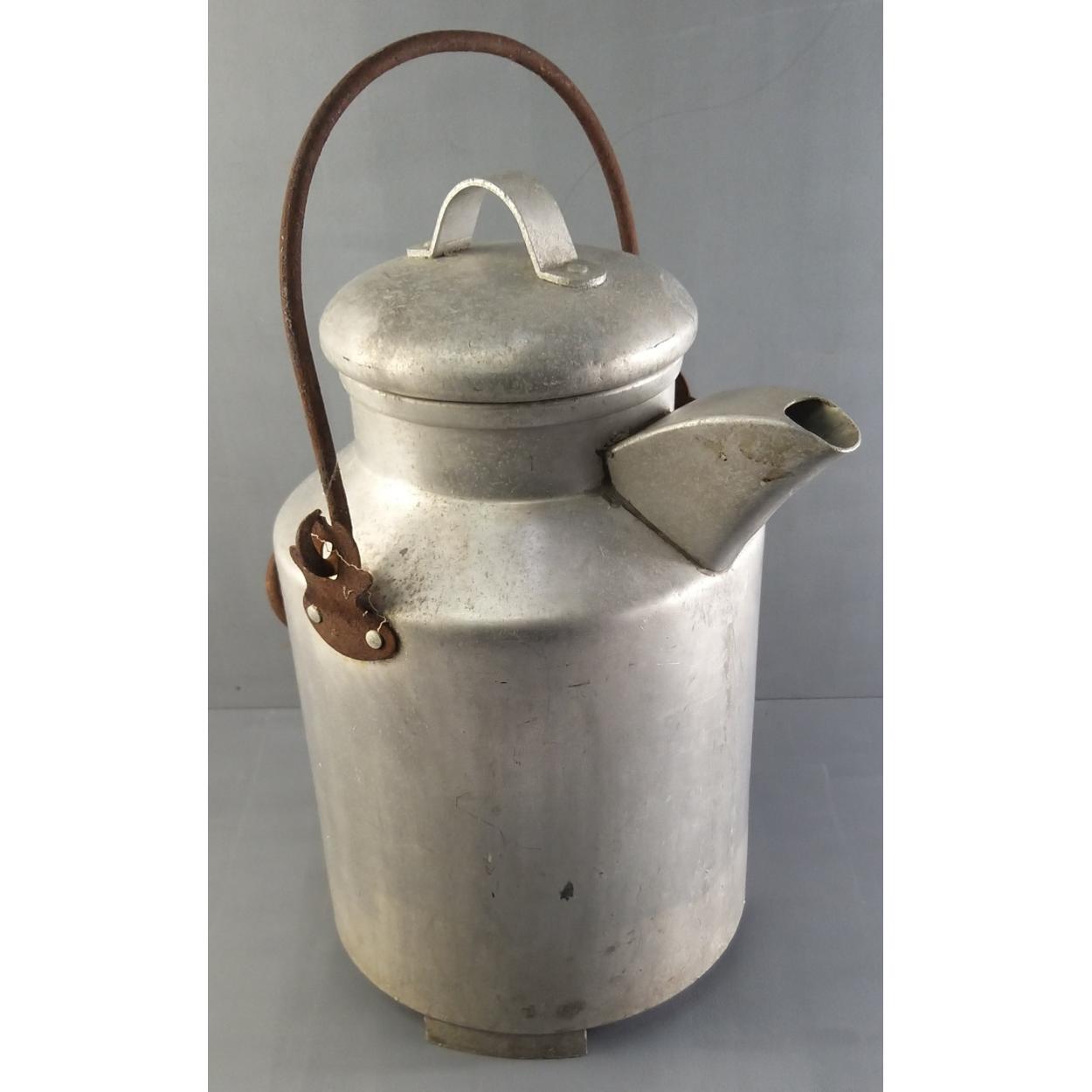 An aluminium vintage lidded milk pail / milk pourer. Stands 42cm tall approx. Would look good in the garden with a floral display.