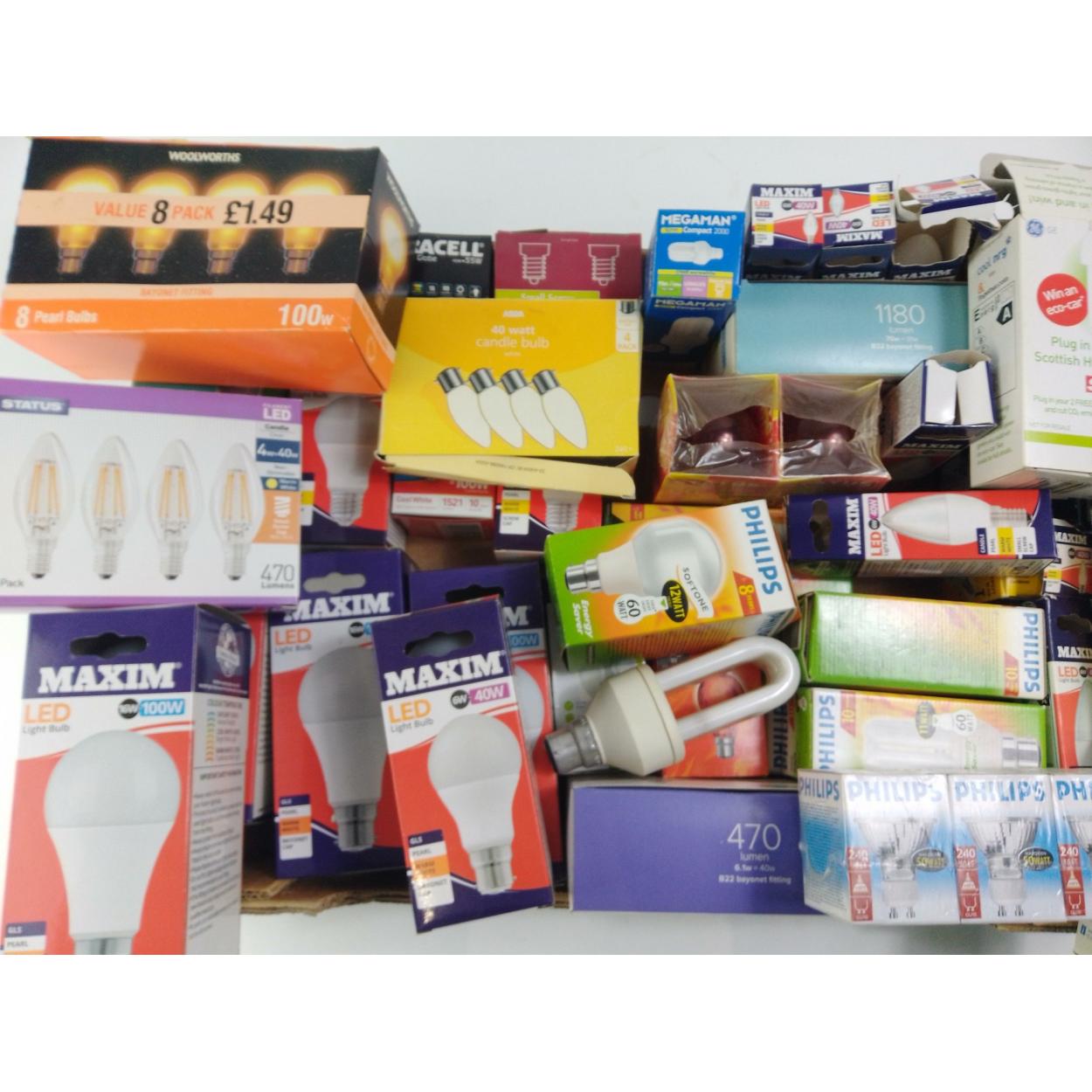 A box full of light bulbs of all kinds including LED, candle, made by PHILIPS, MAXIM and others