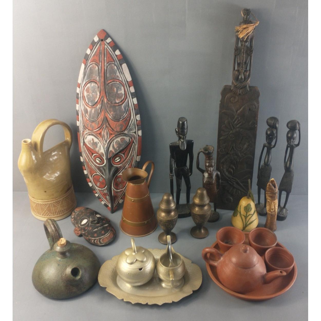 A mixed lot of items of interest including pottery, jug, kettle, wooden wall masks, 4 African pieces, condiment tray, terracotta tea service, pear bell