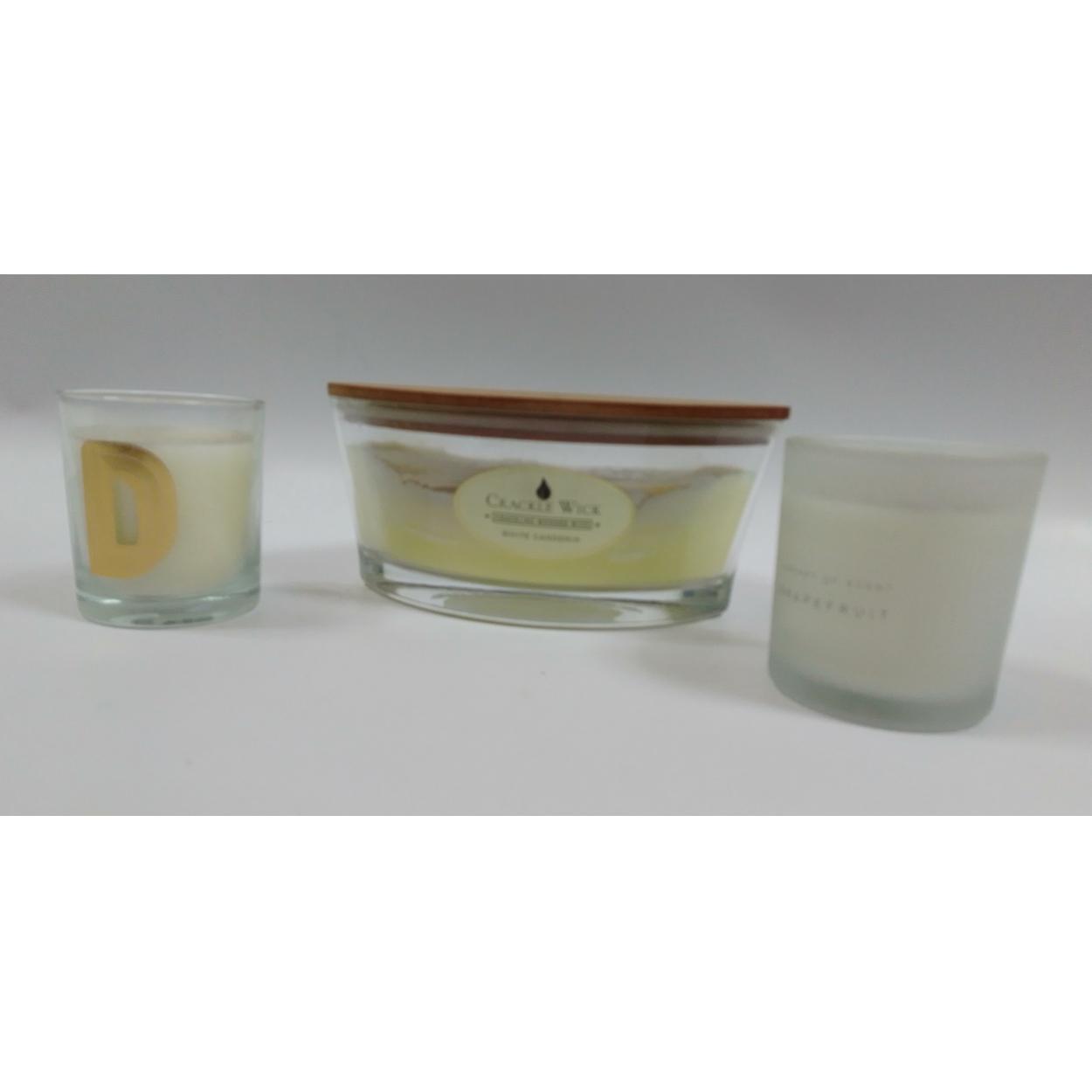A large CRACKLE WICK white gardenia candle plus a grapefruit and a white jasmine candle