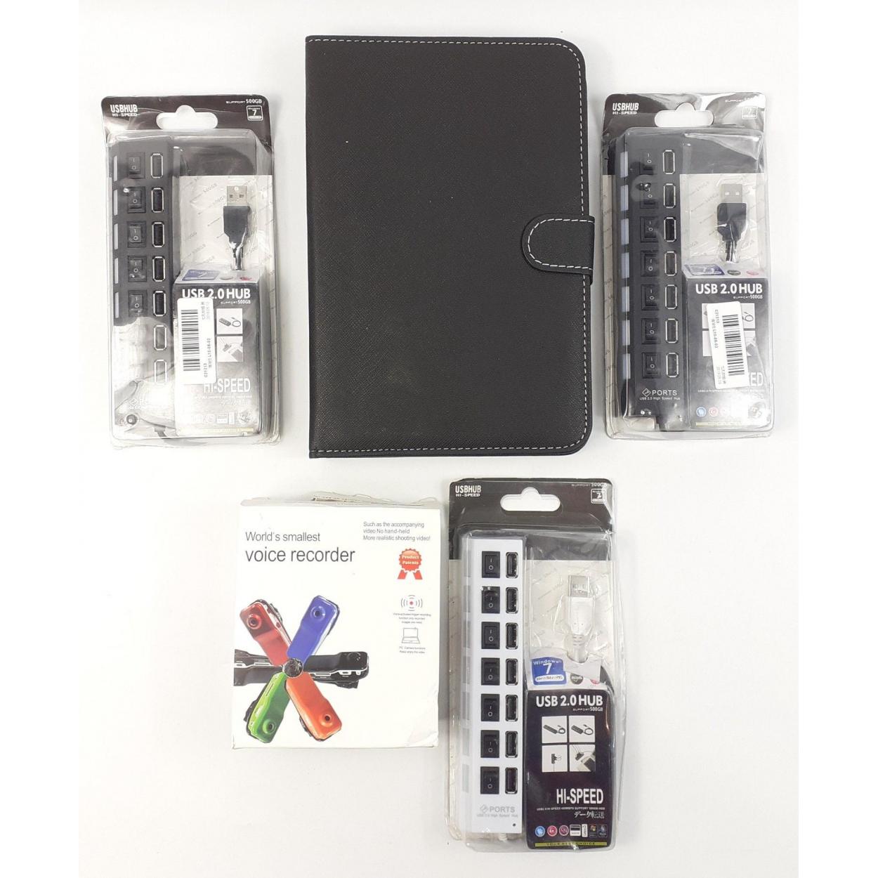 A lot for the technology buffs to include an iPad keyboard with cover, three hi-speed USB 2.0 hubs in blister packs 2 black and 1 silver, compatible with Windows 7, the 'World's Smallest Voice Recorder',