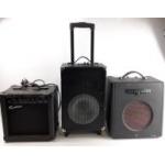 Three portable amplifiers a BEHRINGER Thunderbird BX108 (35cm tall), a ROCKBURN 15B 15W (30cm tall), and an INTEMPO amplifier on wheels