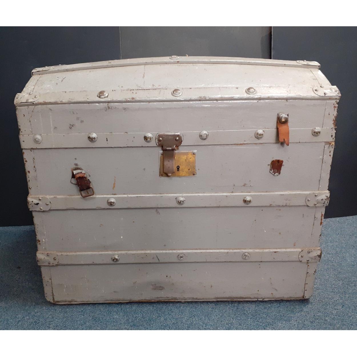 A large dome topped trunk painted grey. Useful storage piece.