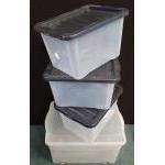 Three plastic storage tubs with lids (38x34cm) plus one large storage tub with 2 opening slats on wheels (57x40cm)