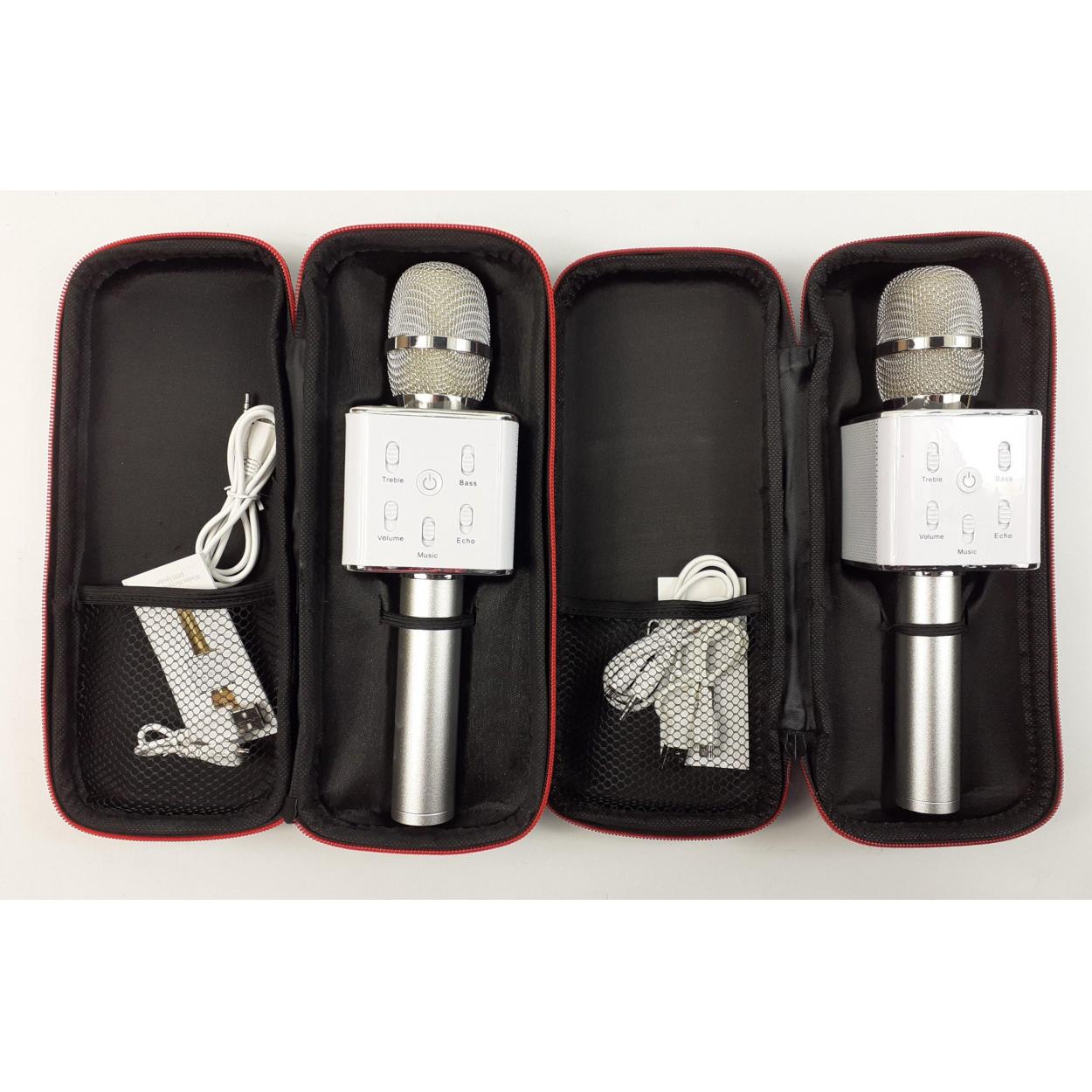 Two silver wireless microphone and hi-fi speakers in soft quality cases