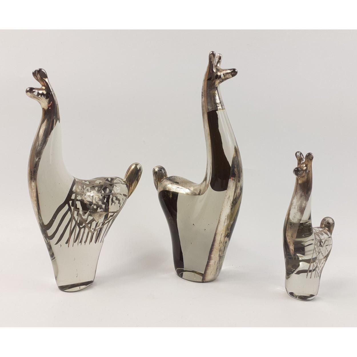 A family of three glass and silvered Llamas the tallest being 19cm. All in very good undamaged condition. A pretty little unusual group.