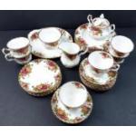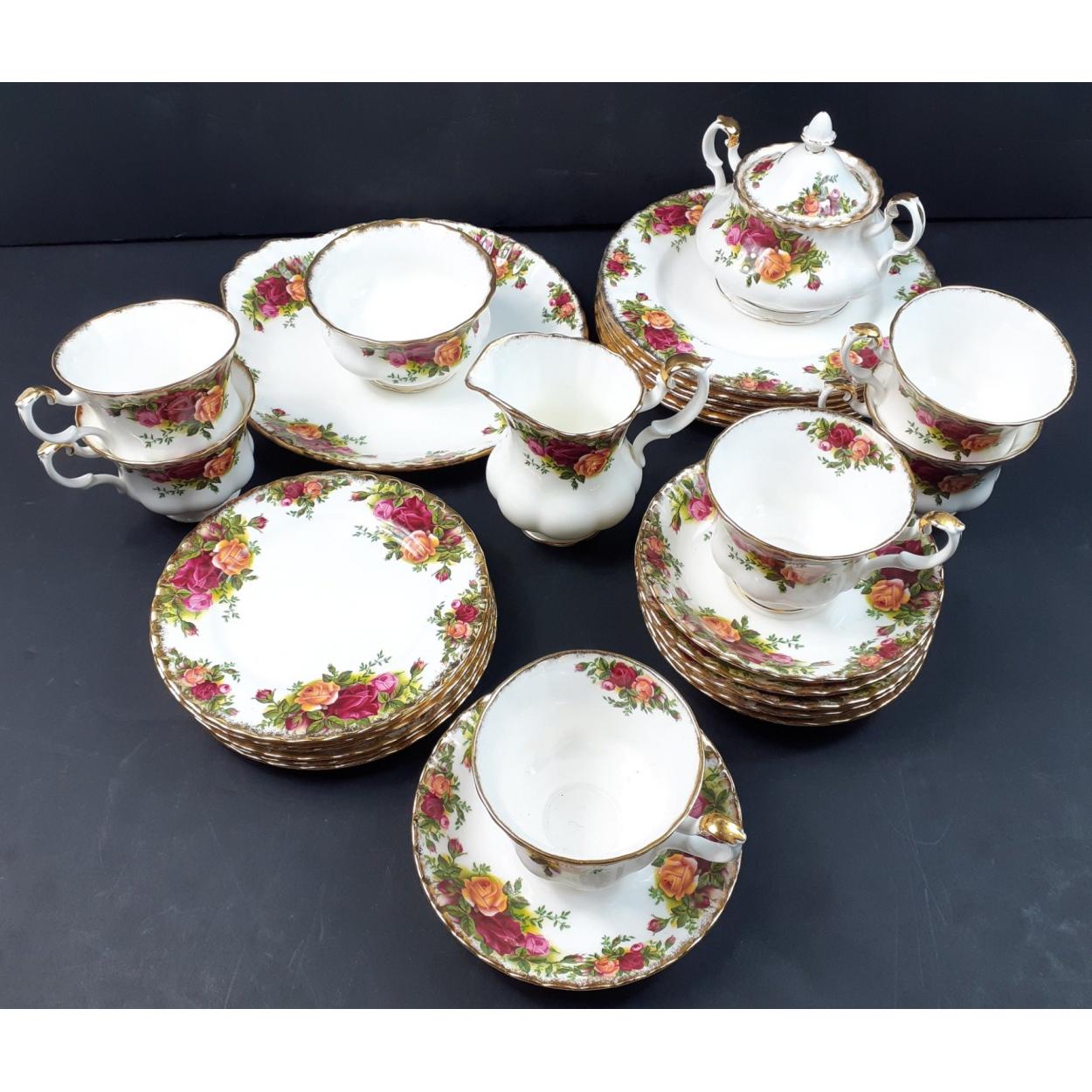 A ROYAL ALBERT Old Country Roses tea service comprising 6 cups, 6 saucers, 6 plates (16cm), 6 plates (21cm), 1 sandwich dish 23cm dia, 1 milk jug, 1 lidded sugar bowl and 1 open bowl (11cm dia). All in excellent order with no chips, cracks etc
