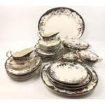 A vintage STOKE POTTERY dinner service in the Crete pattern to include 10 x 20cm plates, 9 x 25cm plates, 9 x 27cm plates, 3 ashets 27cm, 29cm and 32cm plus a sauceboat with underplate. Some wear to ashets, otherwise good condition for their age,