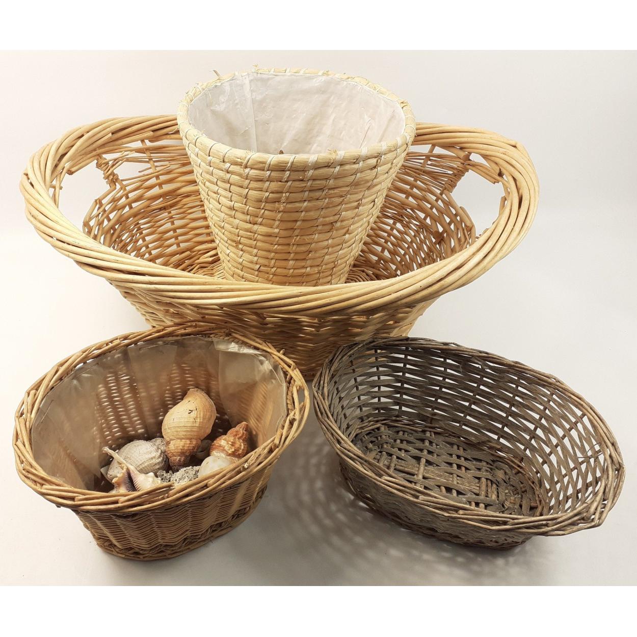 A wicker laundry basket approx 55cm long plus 1 wastepaper basket and 2 baskets for plants etc