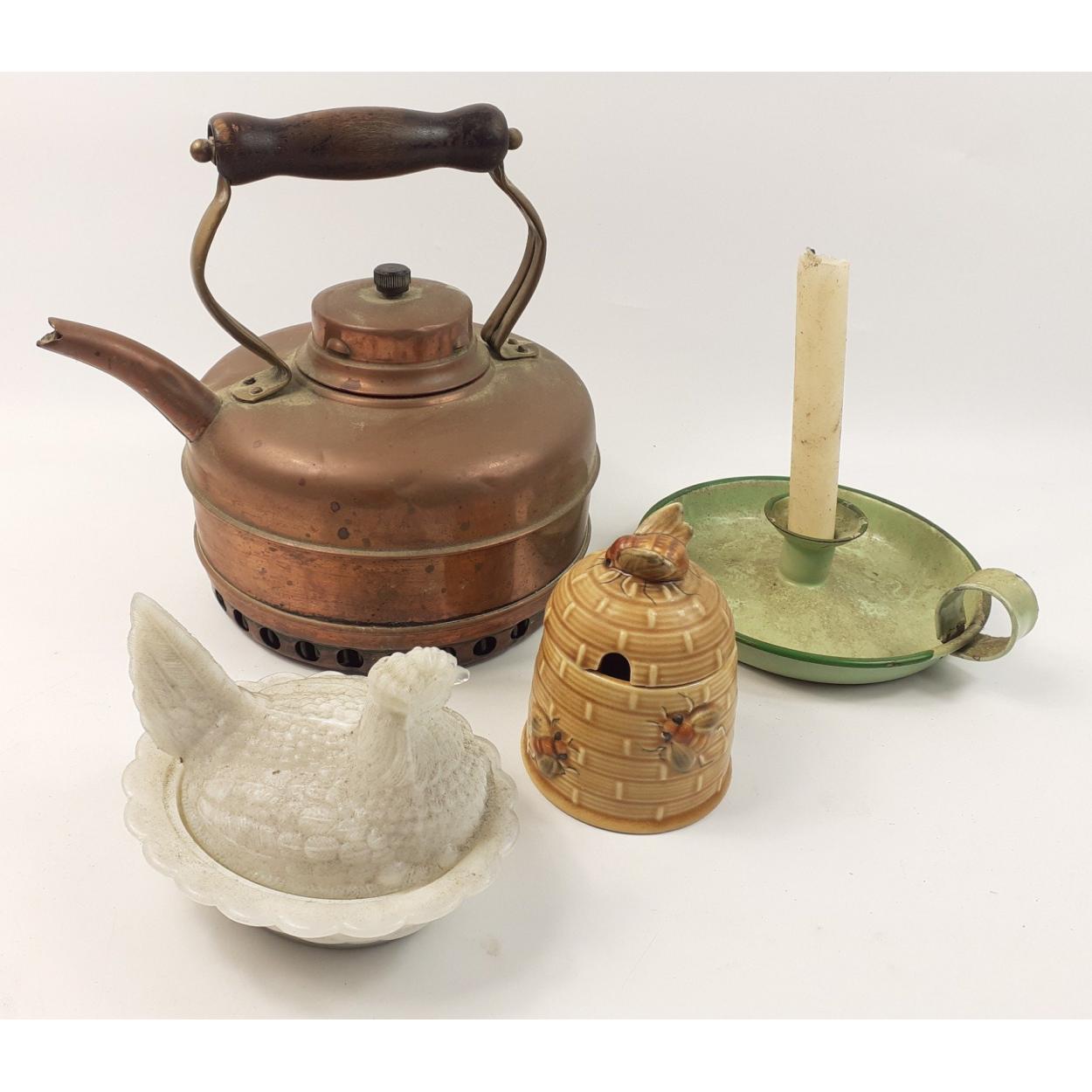 A decorative vintage copper kettle with an enamel candlestick holder, a glass egg dish and a bee hive honey pot.