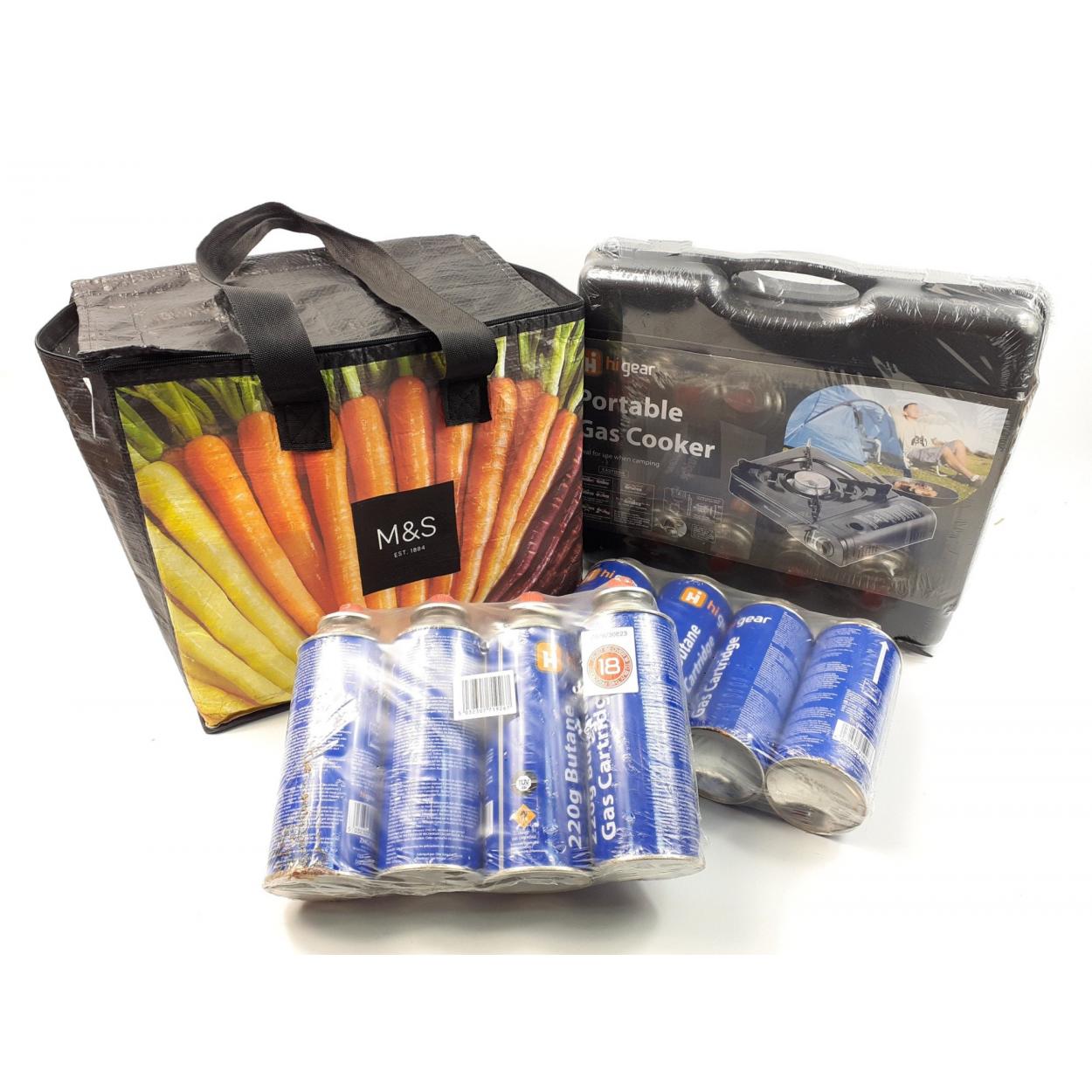 A portable gas camping cooker brand new with eight cans of butane in a M&S cool bag.