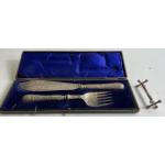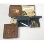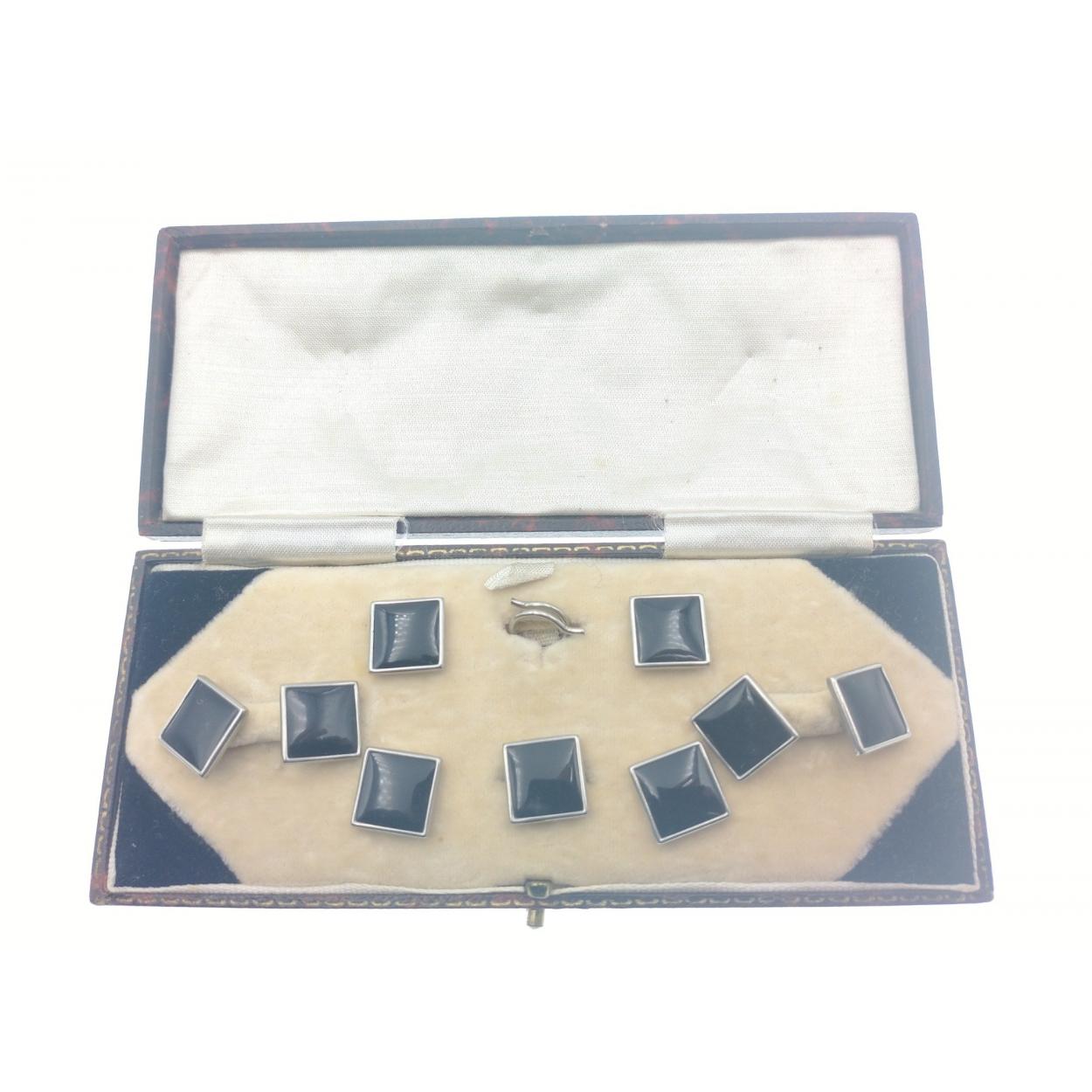 Art Deco style boxed cufflinks and studs in square black enamel design set in white metal.