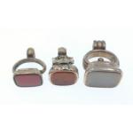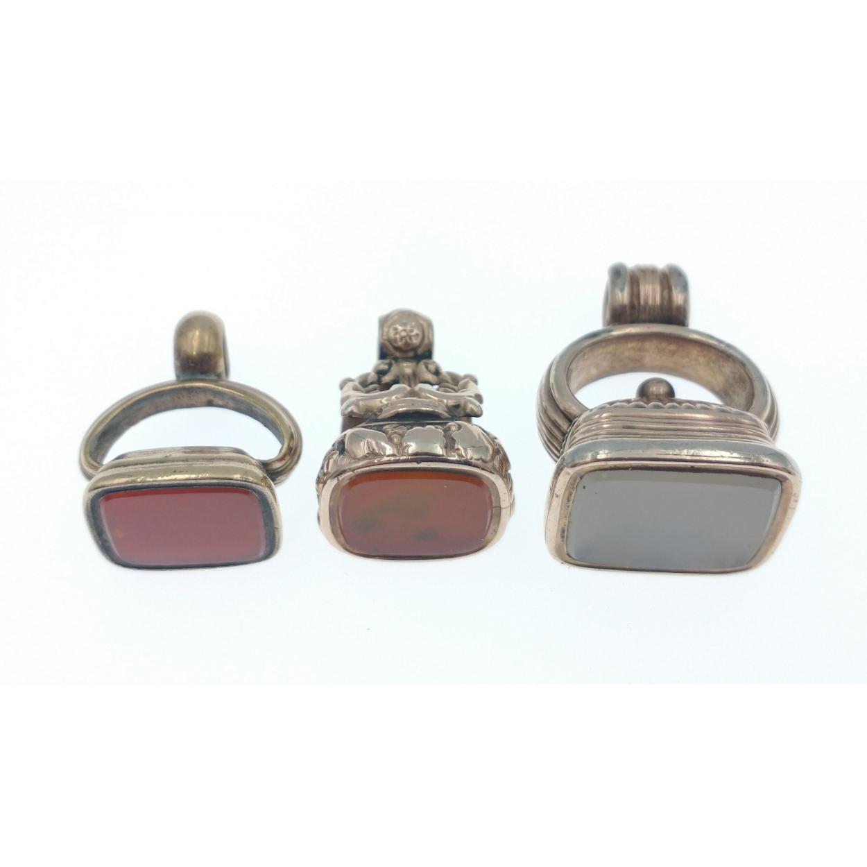 3 Antique yellow metal fob seals. 2 set with orange/red agate and the third milky white agate. The largest is 2.25cm x 2cm