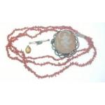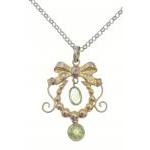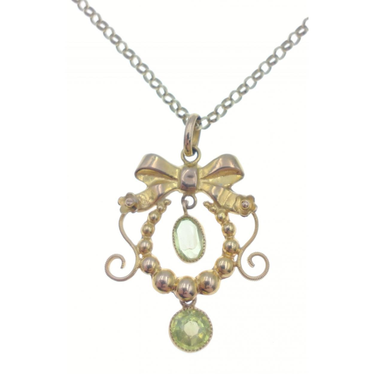 9ct stamped Victorian Necklace and chain, design of bow topped scrolled wreath with 2 drop set Tourmalines. [39cm long inclusive ]