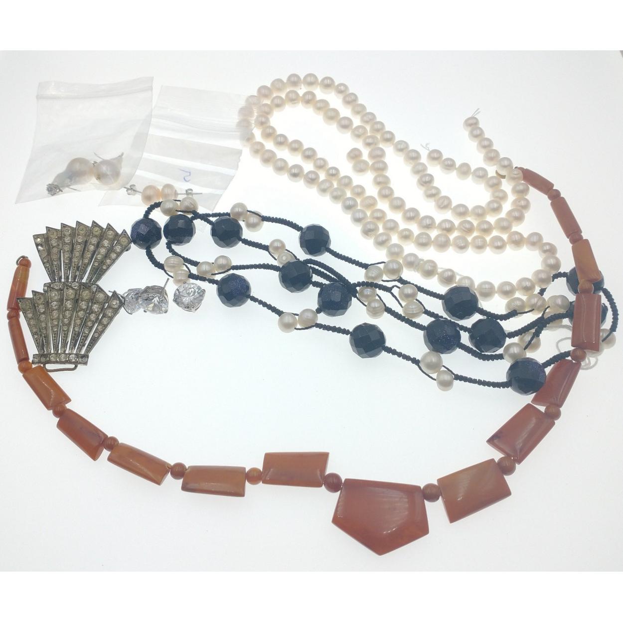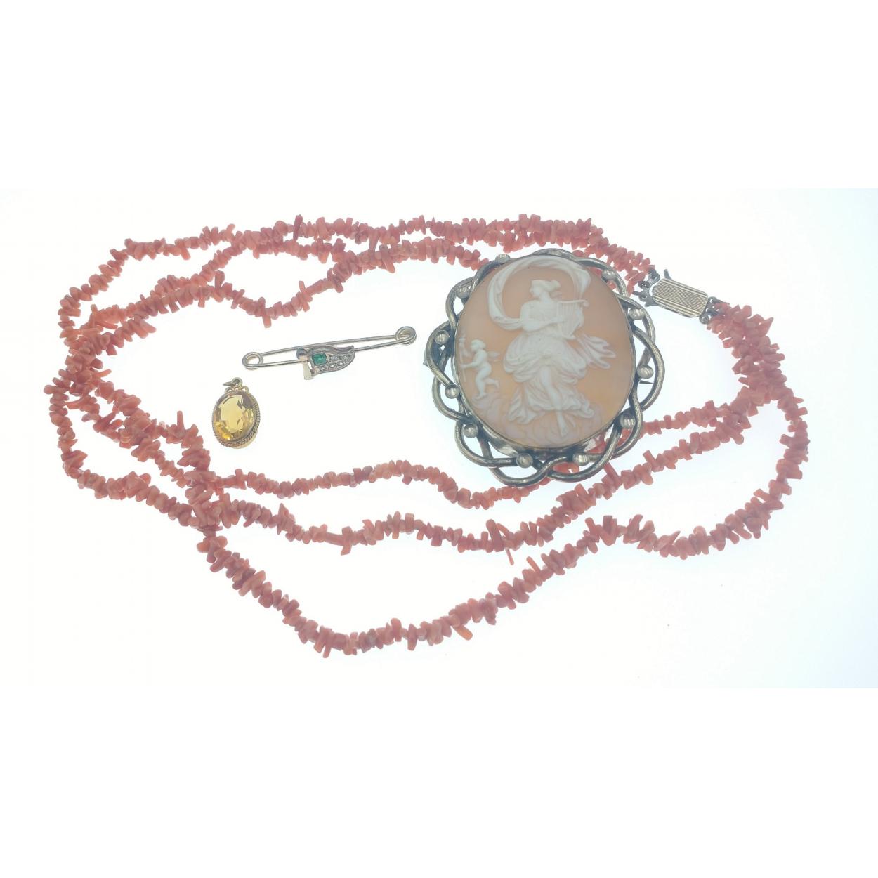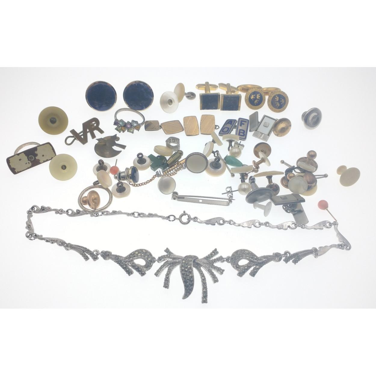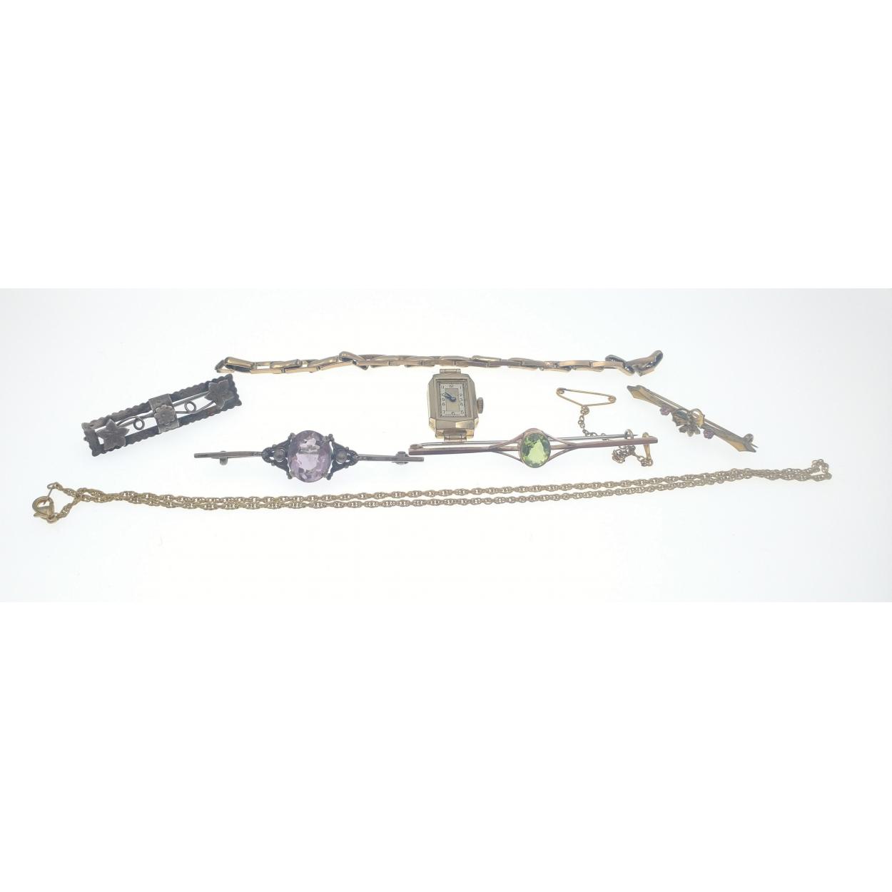 Mixed lot to include yellow metal bar brooch set with pale green stone , and other pieces of metal and silver
