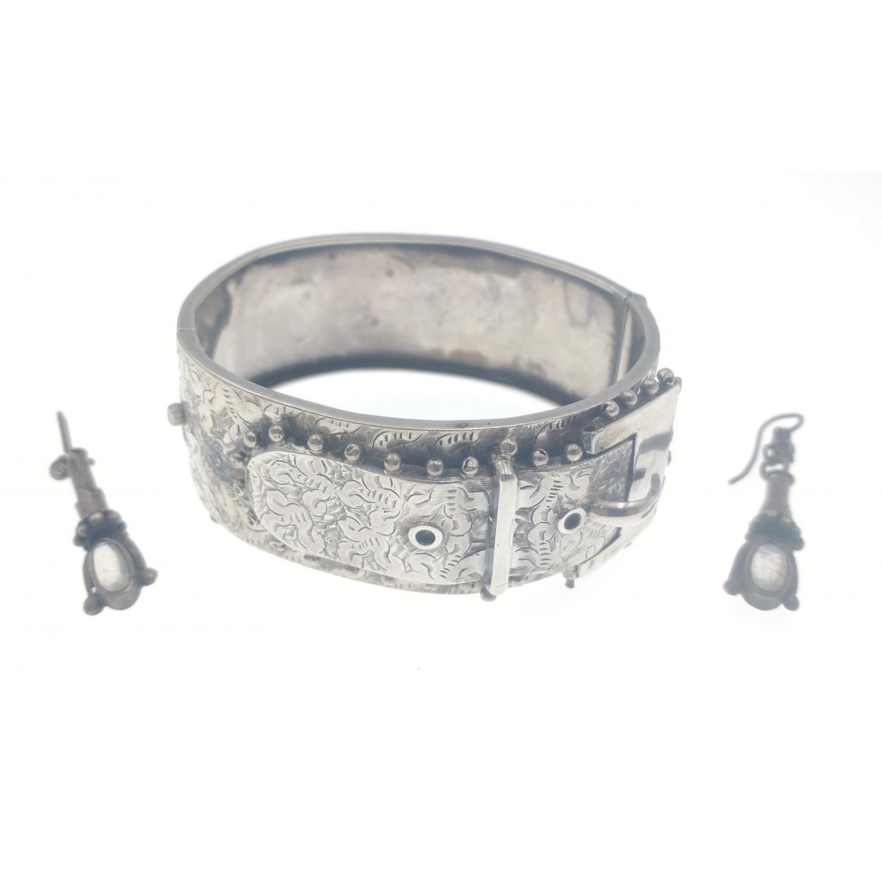 Victorian silver bangle in design of belt with buckle, and a pair of moonstone set drop earrings,
