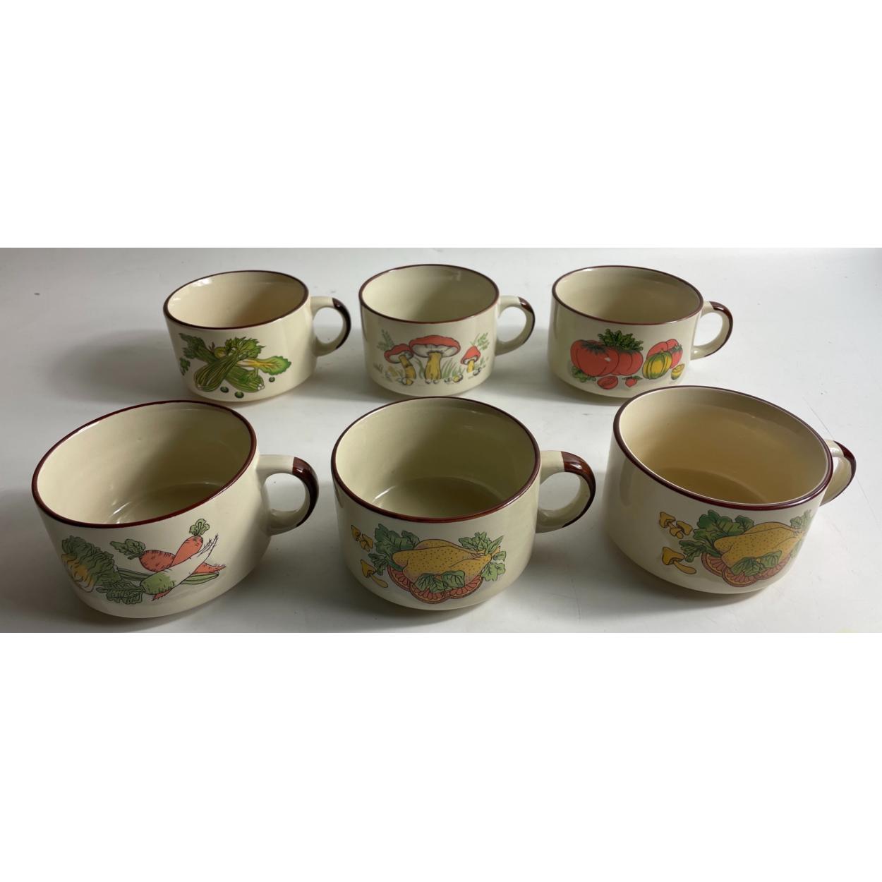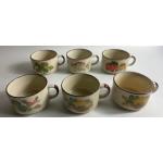 Set of six soup bowls all decorated with designs for different soups including chicken, celery, vegetable, mushroom etc.