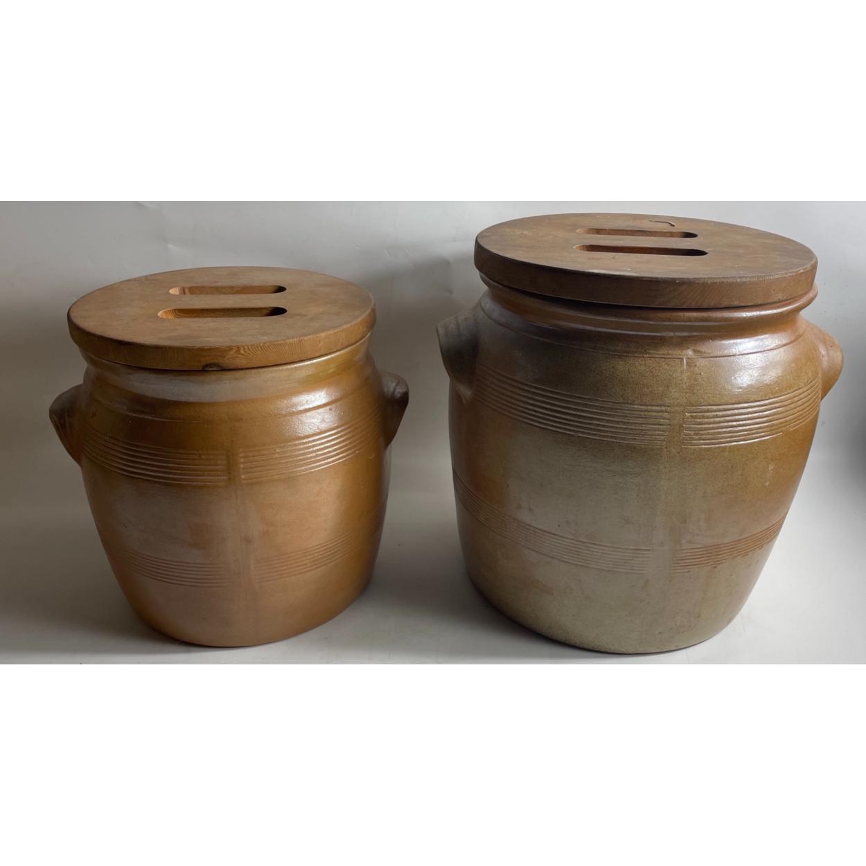 Two HUGE! GLAZED EARTHENWARE POTS with lids standing 28 and 33cm tall.