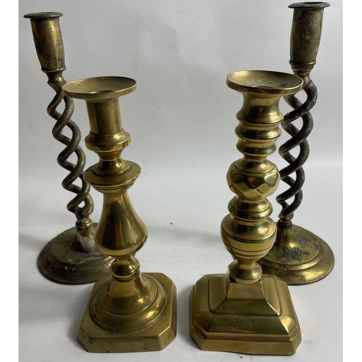 Four metal candlesticks 2 of which stand 26cm high, the other pair with barley twist legs are approx 30cm tall.