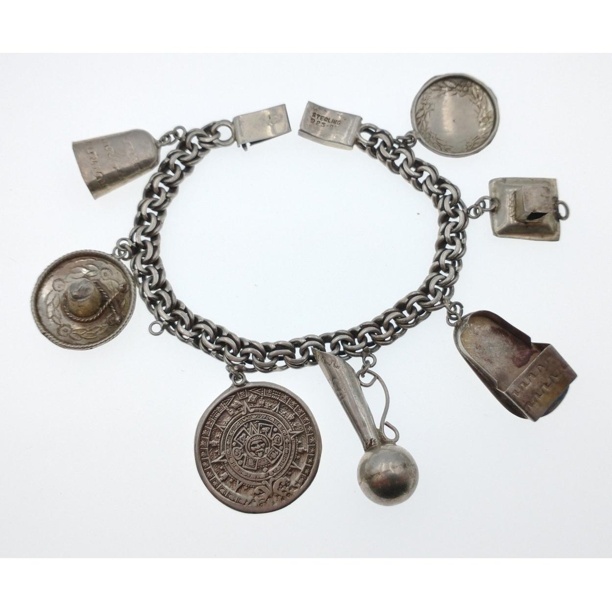 A CHARM BRACELET stamped Sterling 925 with 7 charms, one of which is stamped Sterling 925, gross weight 30.06 g.