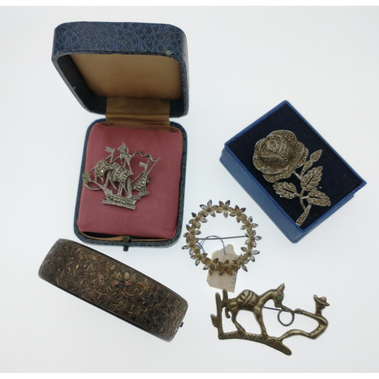 VINTAGE JEWELLERY A metal brooch stamped 800 6cm length, plus 3 brooches to include a rose 5cm and a sailing ship 4cm and a snap shut metal bracelet