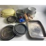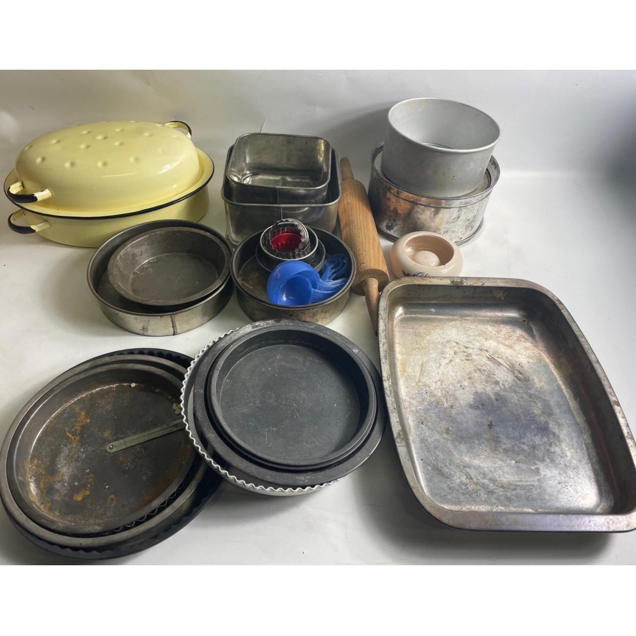 BAKEWARE GALORE - a fine collection of baking dishes to include loose-bottomed pans, flan rings, cake tins both square and round, roasting tins - including an enamel roasting tin with lid (32cm approx.) etc