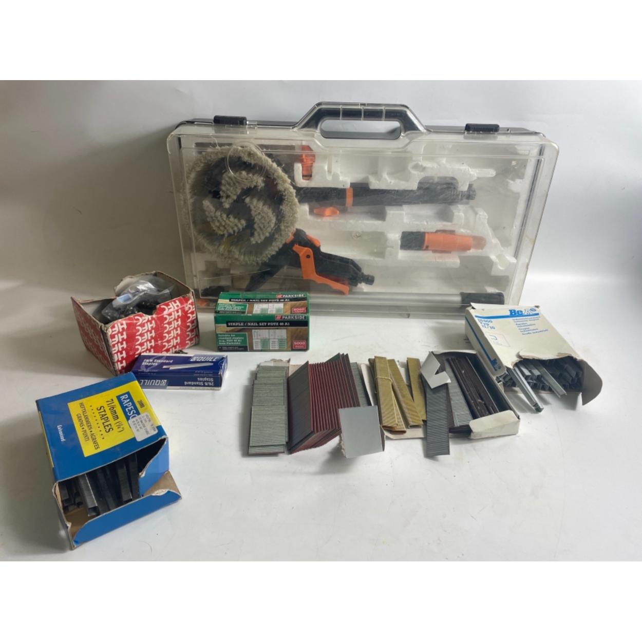 A MIXED box to include a good supply of nails, staples and a car wash set